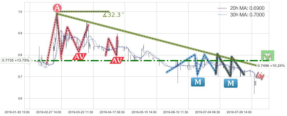 ♘ 在最后的下跌阶段2019-02-25 11:30至2019-07-31 15:00,存在 持续未破位的阻力位 ,阻力价格0.7496,可信任强度85.05%,其距离最后价格0.6800相差 +10.24%