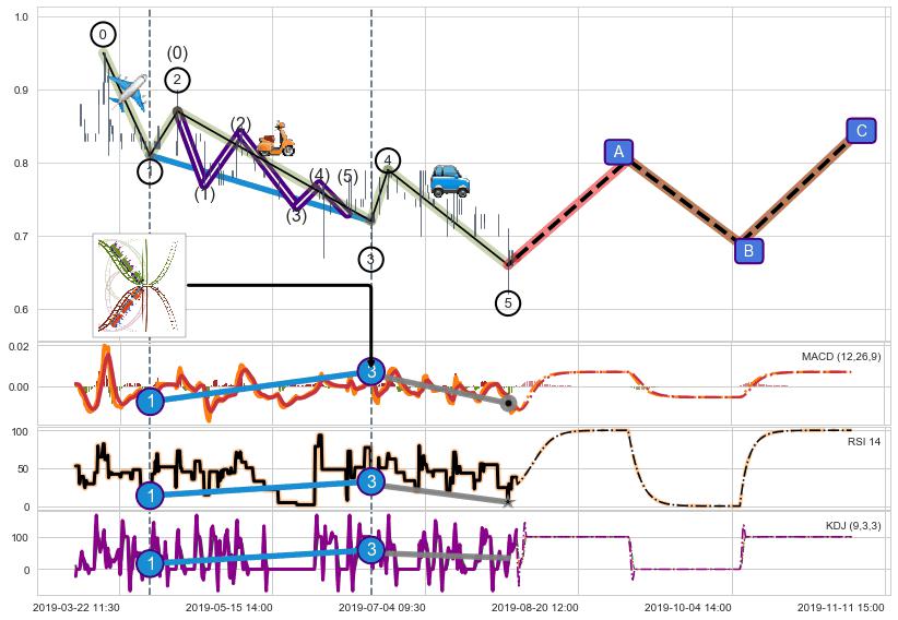 ➢ 1,3,5驱动浪MACD, RSI, KDJ走势都出现【常规背离】反转信号增强