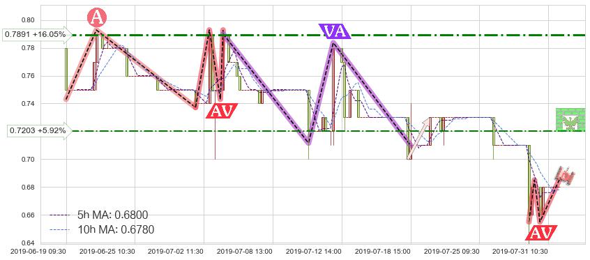 ♘ 阻力价格位0.7203,可信任强度47.23%,距离最后交易2019-07-31 15:00形成的收盘价格0.6800相差 +5.92%
