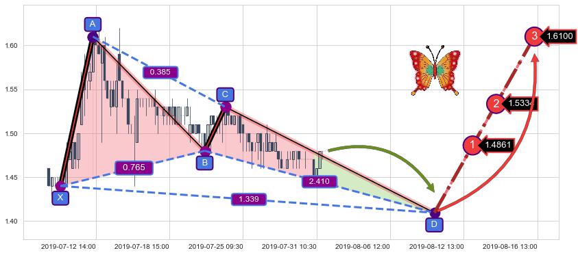 ➣ 未完成【蝴蝶】形态起点X: 07-10:14, 已到达C点: 07-24:09, 预测最终D点: 08-08:15, 共123交易小时