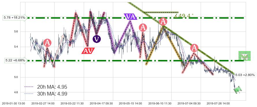 ♘ 阻力价格位5.78,可信任强度99.00%,距离最后交易2019-07-31 15:00形成的收盘价格4.89相差 +18.21%