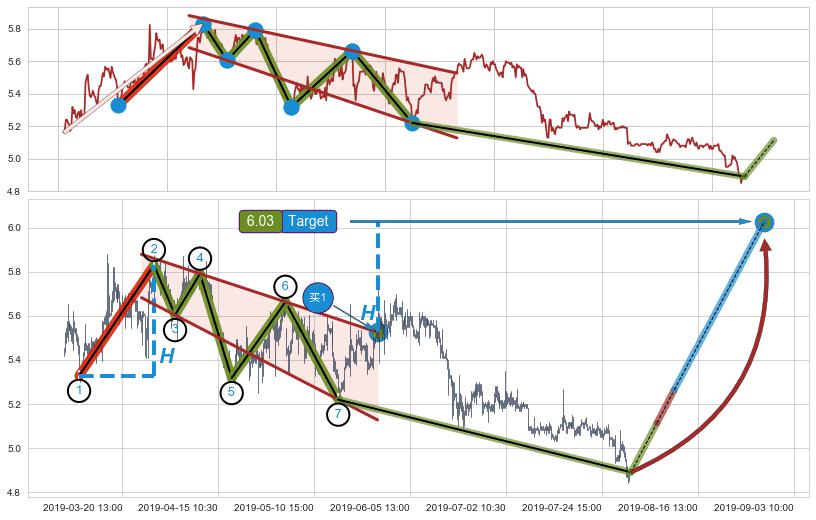 ➢ 最小中继整理跌幅→𝐇: 0.170526 (低点逐步抬高斜边第一支撑点②与阻力边垂直距离)