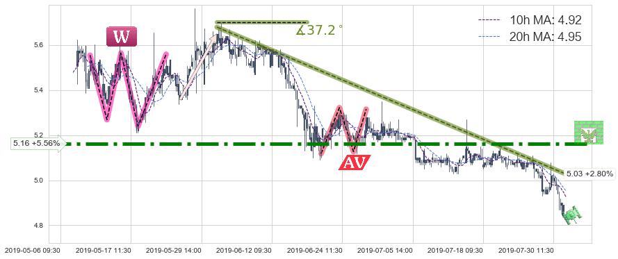 2019-06-25: 第一阻力位5.16有效抑制了下跌浪,成功阻止了价格的继续下跌。