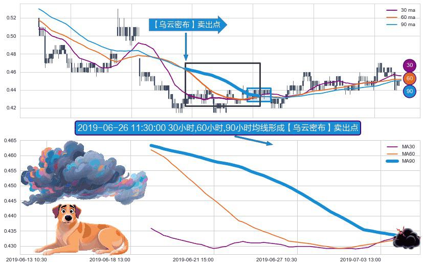 ⚀ 2019-06-19 11:30:00小时-2019-07-04 11:30:00小时显现 30小时-60小时-90小时均线 【乌云密布】卖出点 看空信号,后市看跌,卖出