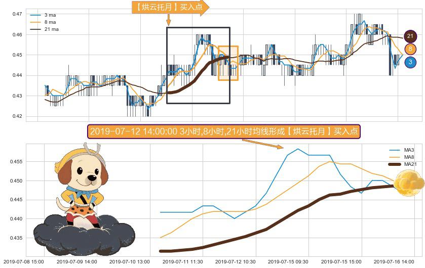 ⚀ 2019-07-10 14:00:00小时-2019-07-16 13:00:00小时显现 3小时-8小时-21小时均线 【烘云托月】买入点 看多信号,后市看涨,买入