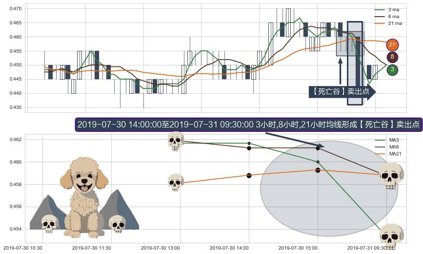 ⚀ 2019-07-30 15:00:00-小时至2019-07-31 09:30:00-小时显现 3小时-8小时-21小时均线 【死亡谷】卖出点 看空信号,后市看跌,卖出