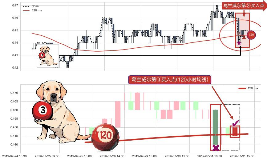 ⚀ 2019-07-31 13:00:00-小时显现 葛兰威尔均线 120小时均线 第③买入点 上升趋势的中继信号,后市看涨,买进信号