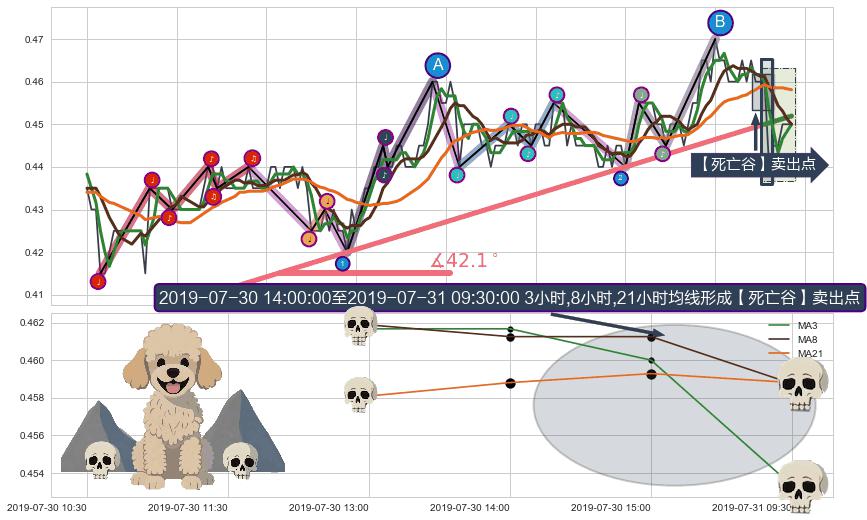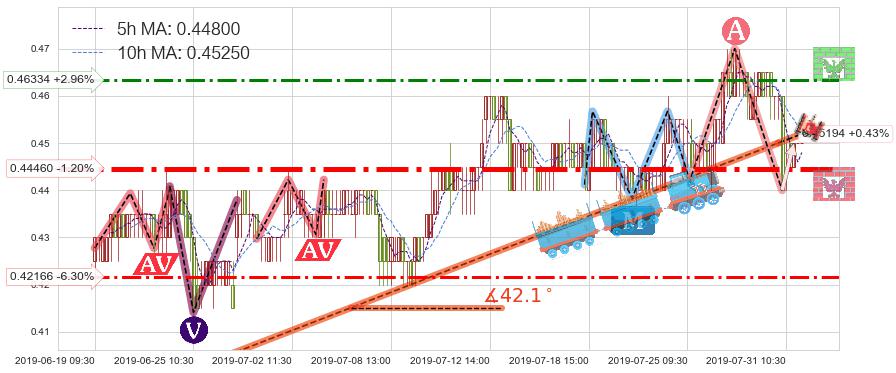 ✂️ 2019-06-25 10:30-2019-07-30 15:00上升趋势存在反转[风险],虽然原上升趋势的支撑位(0.45194)已破位,但其支撑效果尚存,原上升趋势角度: 42.1˚