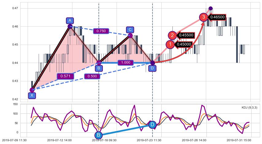 ➢ 谐波价格D点比B点低 ⤵,【KDJ】指标D点比B点高 ⤴️