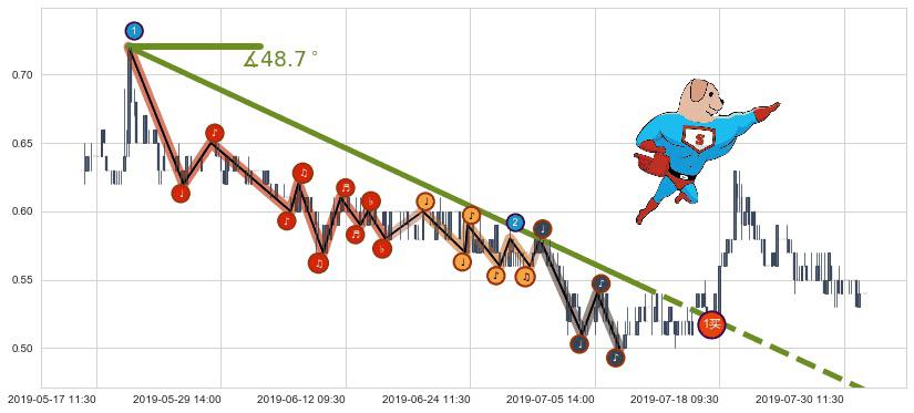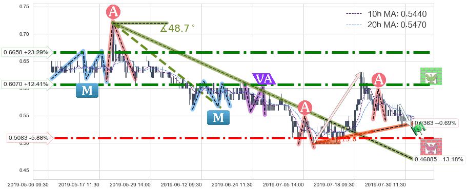 ⚔️ 2019-05-21 13:00-2019-07-10 13:00下跌趋势存在反转上涨[机会],其原下跌趋势的阻力位(0.46885)已被突破[强支撑信号],原下跌趋势角度: 48.7˚