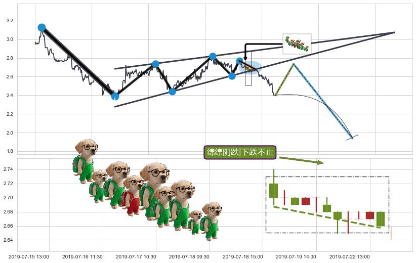 从2019-07-17 10:30至2019-07-31 15:00,共包含65个小时,阶段股价下跌-14.09%,阶段股价变动位移路程比: 1 : 2