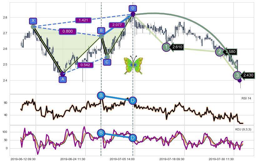 ➣ 已完成【蝴蝶】形态起点X: 06-11:13, 终点D: 07-05:11, 共102交易小时