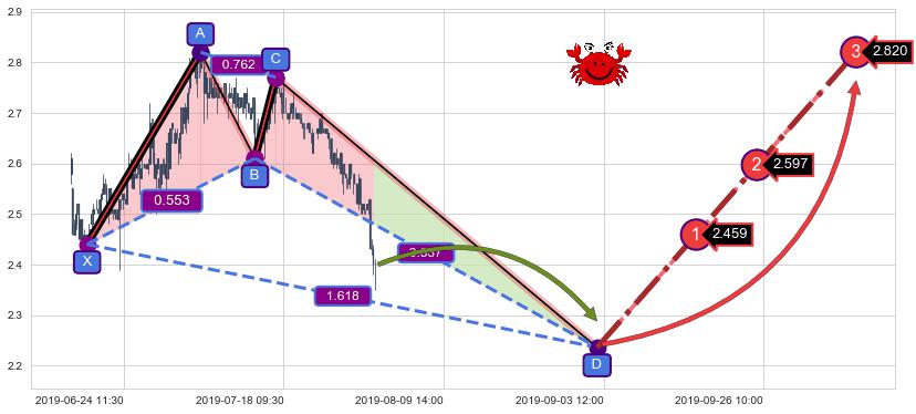 ➢ 距离预测D点位置尚有下跌空间,短线依然【看跌】, 耐心等待看涨【螃蟹】形态反转启动