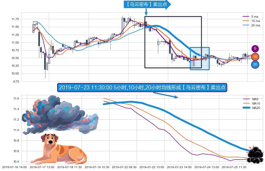 ⚀ 2019-07-19 09:30:00小时-2019-07-25 13:00:00小时显现 5小时-10小时-20小时均线 【乌云密布】卖出点 看空信号,后市看跌,卖出