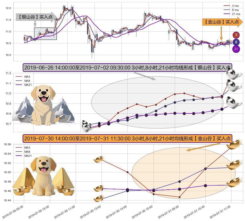 ⚃ 2019-07-30 15:00:00-小时至2019-07-31 11:30:00-小时显现 3小时-8小时-21小时均线 【金山谷】买入点 其再次确认了买入信号,可靠性更强,买入