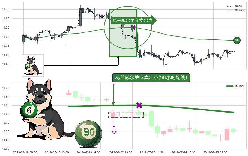 ⚀ 2019-07-22 09:30:00-小时显现 葛兰威尔均线 90小时均线 第⑥卖出点 走势反转见顶信号,后市看跌,卖出信号