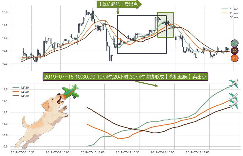 ⚀ 2019-07-09 14:00:00小时-2019-07-18 13:00:00小时显现 10小时-20小时-30小时均线 【战机起航】卖出点 看空信号,后市看跌,卖出