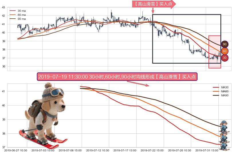 形态多维评估: ⚀ 2019-07-08 14:00:00小时-2019-07-31 15:00:00小时显现 30小时-60小时-90小时均线 【高山滑雪】买入点 看多信号,后市看涨,买入