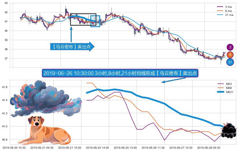 形态多维评估: ⚀ 2019-06-24 09:30:00小时-2019-06-28 10:30:00小时显现 3小时-8小时-21小时均线 【乌云密布】卖出点 看空信号,后市看跌,卖出