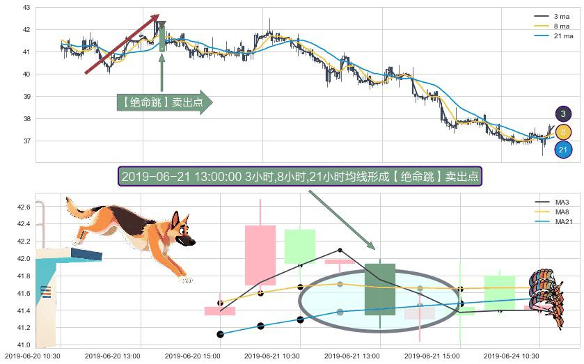 形态多维评估: ⚀ 2019-06-21 13:00:00小时显现 3小时-8小时-21小时均线 【绝命跳】卖出点 看空信号,后市看跌,卖出