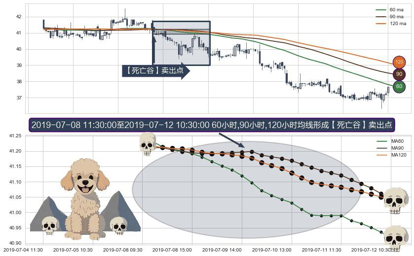 形态多维评估: ⚀ 2019-07-08 13:00:00-小时至2019-07-12 10:30:00-小时显现 60小时-90小时-120小时均线 【死亡谷】卖出点 看空信号,后市看跌,卖出