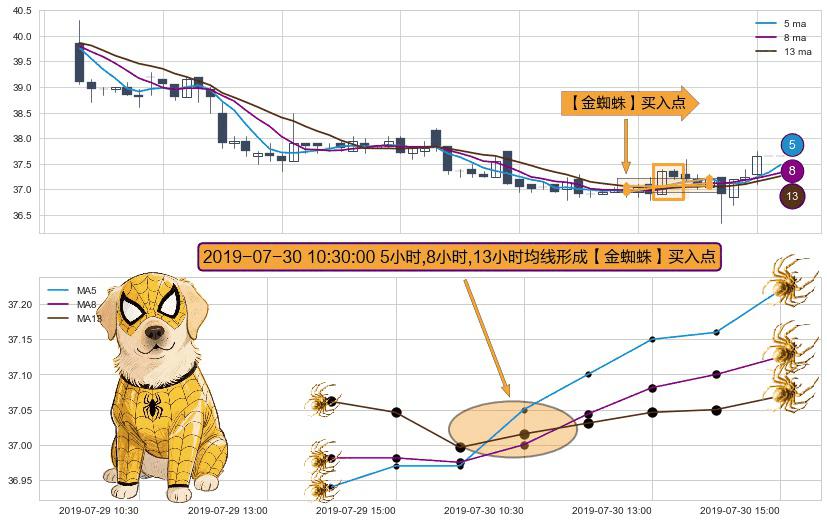 形态多维评估: ⚀ 2019-07-30 10:30:00小时显现 5小时-8小时-13小时均线 【金蜘蛛】买入点 看多信号,后市看涨,买入
