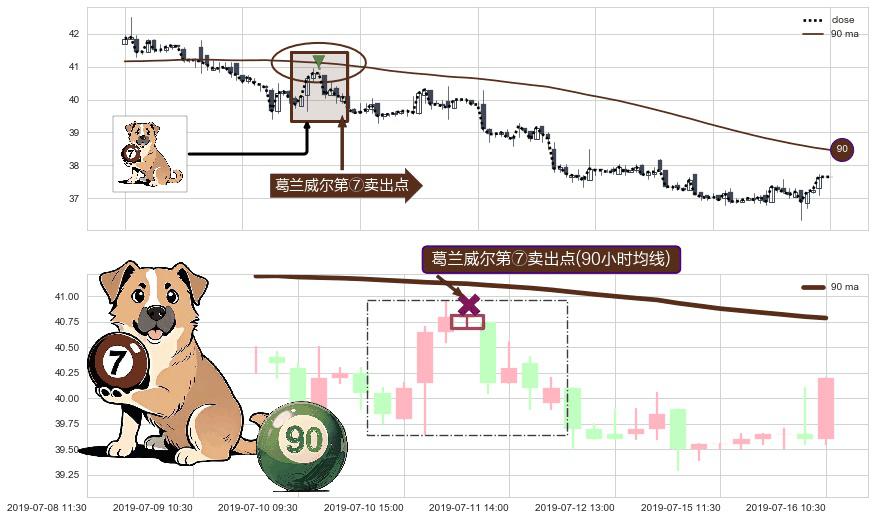 形态多维评估: ⚀ 2019-07-11 11:30:00-小时显现 葛兰威尔均线 90小时均线 第⑦卖出点 下降趋势的中继信号,后市看跌,卖出信号
