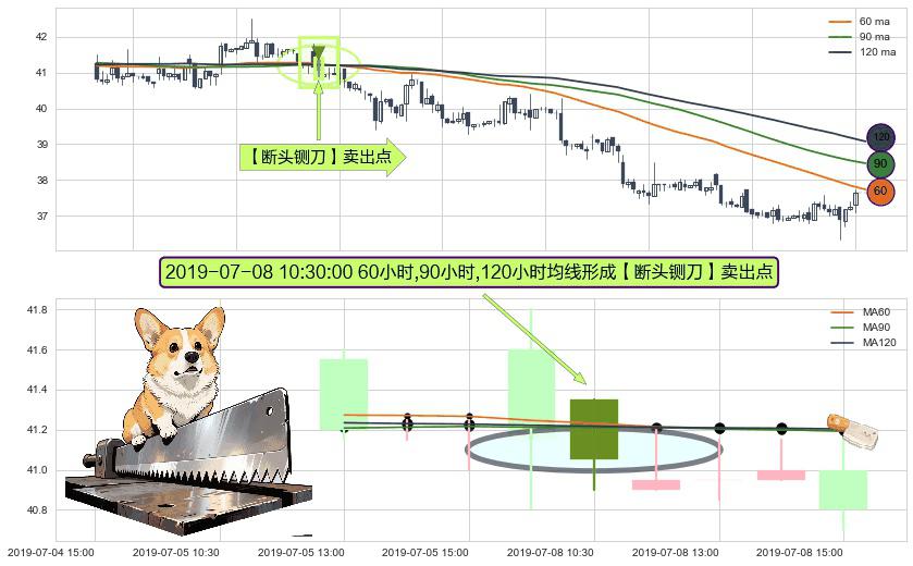 形态多维评估: ⚀ 2019-07-08 10:30:00小时显现 60小时-90小时-120小时均线 【断头铡刀】卖出点 看空信号,后市看跌,卖出