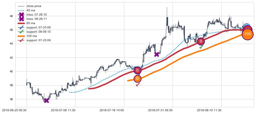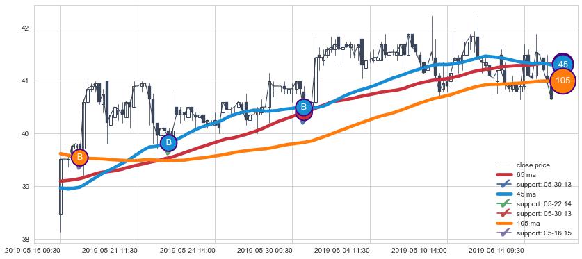 上涨趋势05-16 09:30-06-17 10:30,均线65, 45, 105确认关键支撑3处