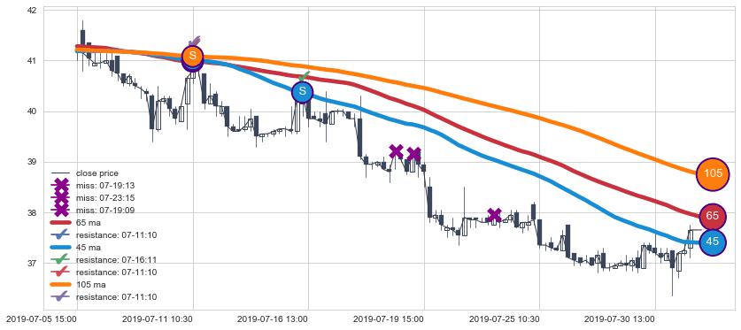 下跌趋势07-05 15:00-07-31 15:00,均线65, 45, 105确认关键阻力2处