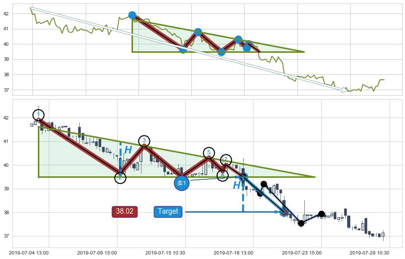 ➢ 【多方力量耗尽,空方打破攻守平衡点】下降三角形中继整理, 已在07-18:09突破【支撑】颈线 39.50 →演变成下降通道