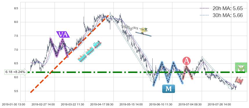 2019-06-18: 时域附近第一阻力位6.18持续的对下跌趋势进行阻拦,有效地放缓了下跌的速度。
