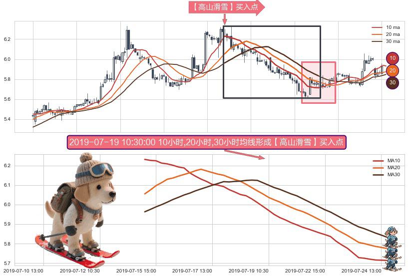 ⚀ 2019-07-15 13:00:00小时-2019-07-24 14:00:00小时显现 10小时-20小时-30小时均线 【高山滑雪】买入点 看多信号,后市看涨,买入