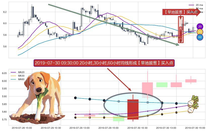⚀ 2019-07-30 09:30:00小时显现 20小时-30小时-60小时均线 【旱地拔葱】买入点 看多信号,后市看涨,买入