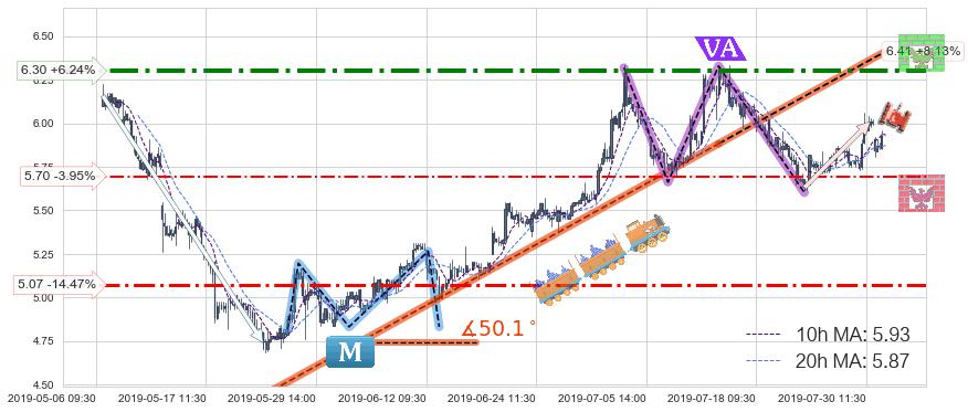 ✂️ 2019-05-23 14:00-2019-07-15 10:30上升趋势存在反转[风险],其原上升趋势的支撑位(6.41)已破位[强阻力信号],原上升趋势角度: 50.1˚