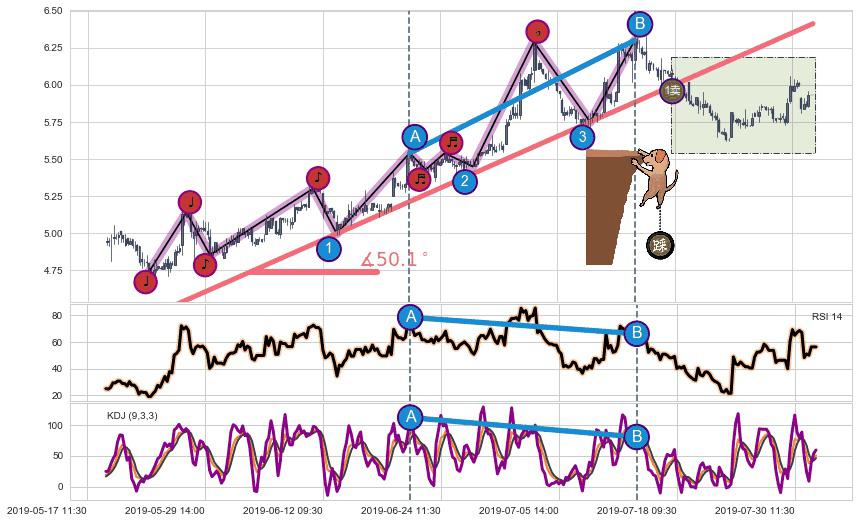 ➢ 最后的上涨趋势2019-05-23 14:00至2019-07-15 10:30:存在破位迹象,后续小调整或者反转下跌