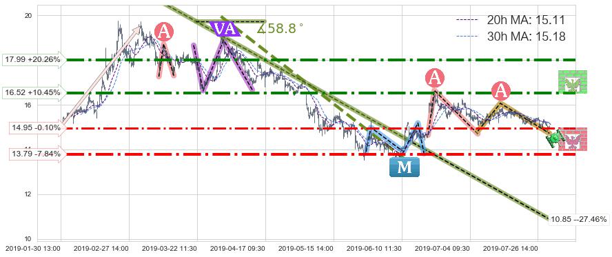 ♘ 阻力价格位17.99,可信任强度77.97%,距离最后交易2019-07-31 15:00形成的收盘价格14.96相差 +20.26%