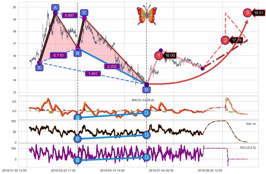 ➣ 已完成【蝴蝶】形态起点X: 02-15:14, 终点D: 06-05:14, 共439交易小时