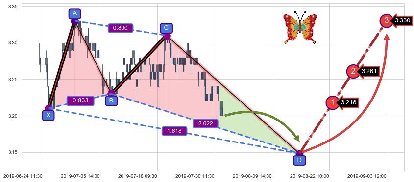 ➣ 未完成【蝴蝶】形态起点X: 06-25:10, 已到达C点: 07-19:11, 预测最终D点: 08-15:14, 共215交易小时