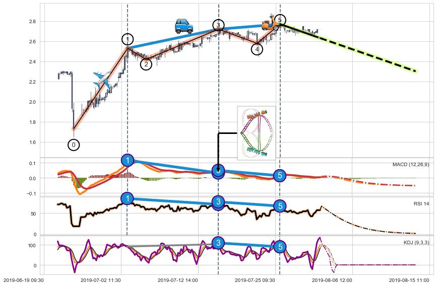 ➣ 1,3,5驱动浪MACD, RSI, KDJ走势都出现【常规背离】反转信号增强
