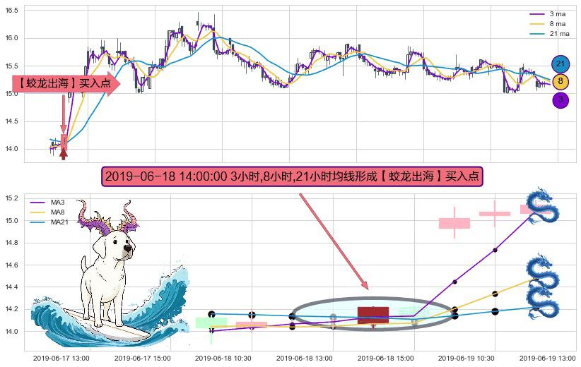 ⚀ 2019-06-18 14:00:00小时显现 3小时-8小时-21小时均线 【蛟龙出海】买入点 看多信号,后市看涨,买入