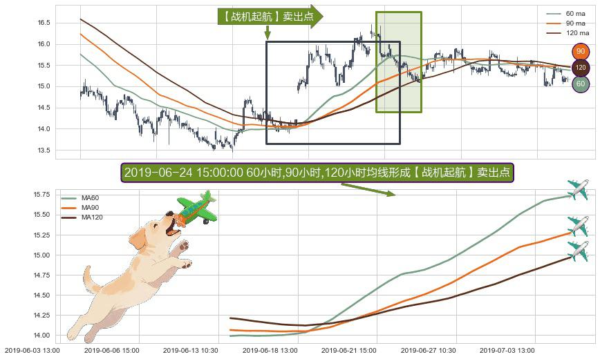 ⚀ 2019-06-13 14:00:00小时-2019-07-05 09:30:00小时显现 60小时-90小时-120小时均线 【战机起航】卖出点 看空信号,后市看跌,卖出
