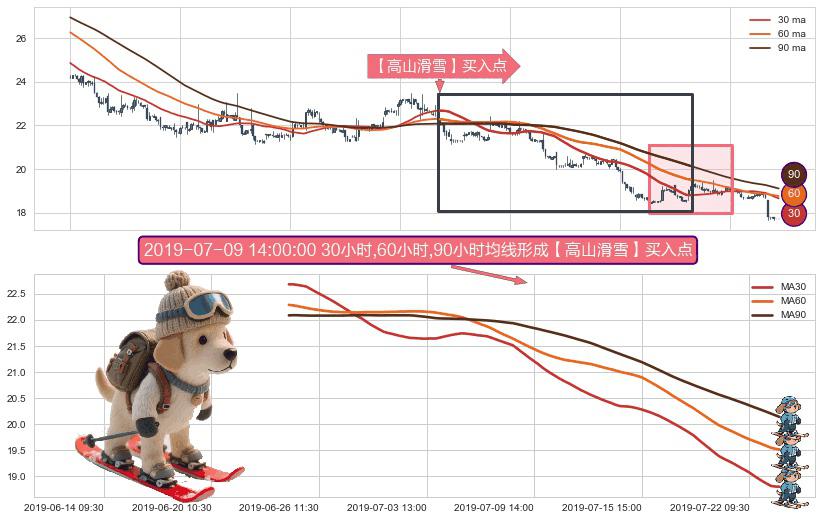 形态多维评估: ⚀ 2019-06-25 10:30:00小时-2019-07-23 10:30:00小时显现 30小时-60小时-90小时均线 【高山滑雪】买入点 看多信号,后市看涨,买入