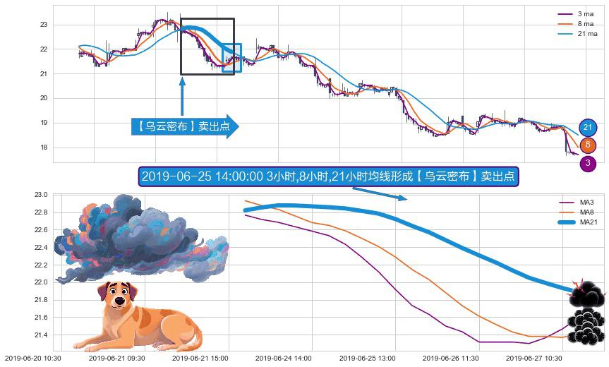 形态多维评估: ⚀ 2019-06-24 09:30:00小时-2019-06-27 11:30:00小时显现 3小时-8小时-21小时均线 【乌云密布】卖出点 看空信号,后市看跌,卖出