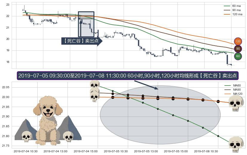 形态多维评估: ⚀ 2019-07-05 10:30:00-小时至2019-07-08 11:30:00-小时显现 60小时-90小时-120小时均线 【死亡谷】卖出点 看空信号,后市看跌,卖出