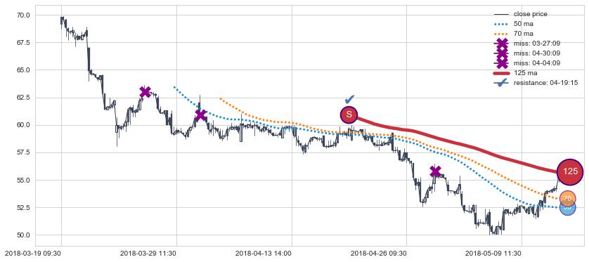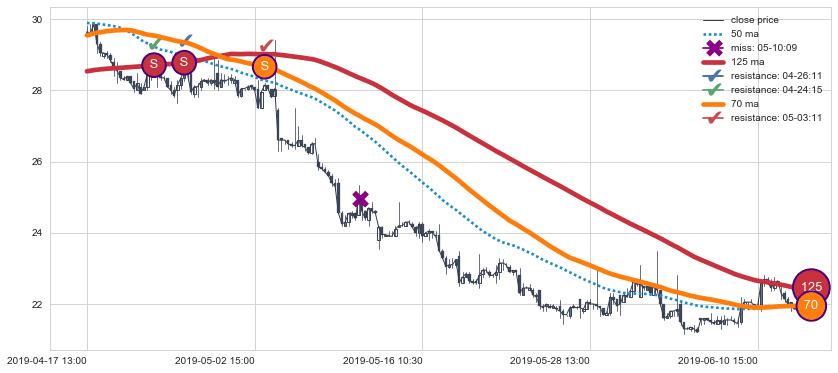 下跌趋势04-17 13:00-06-12 14:00,均线125, 70确认关键阻力3处