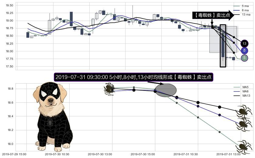 形态多维评估: ⚀ 2019-07-31 09:30:00小时显现 5小时-8小时-13小时均线 【毒蜘蛛】卖出点 看空信号,后市看跌,卖出