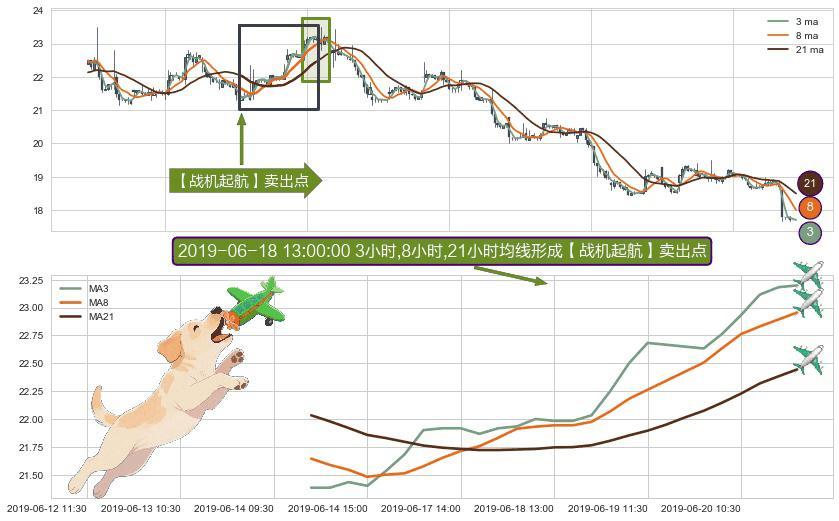 形态多维评估: ⚀ 2019-06-14 11:30:00小时-2019-06-20 14:00:00小时显现 3小时-8小时-21小时均线 【战机起航】卖出点 看空信号,后市看跌,卖出