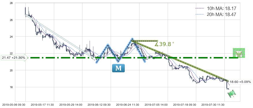 从2019-06-20 11:30至2019-07-31 15:00,共包含172个小时,阶段股价下跌-26.48%,阶段股价变动位移路程比: 1 : 3,下跌趋势角度: 39.8
