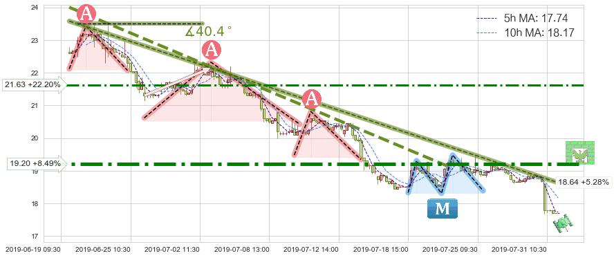 从2019-06-19 13:00至2019-07-31 15:00,共包含177个小时,阶段股价下跌-23.85%,阶段股价变动位移路程比: 1 : 3,下跌趋势角度: 40.4